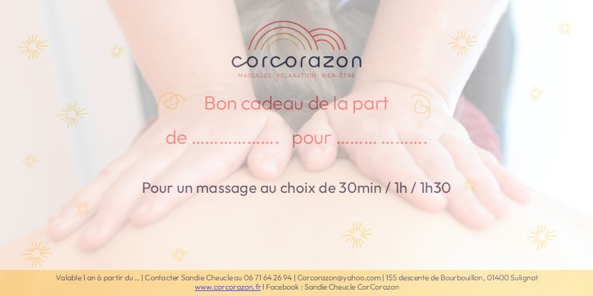 Je vous fournis un bon cadeau prêt à offrir par mail ou à venir chercher au cabinet de Sulignat en convenant d’un horaire avec moi (pendant un massage je ne peux pas m’arrêter pour vous accueillir).